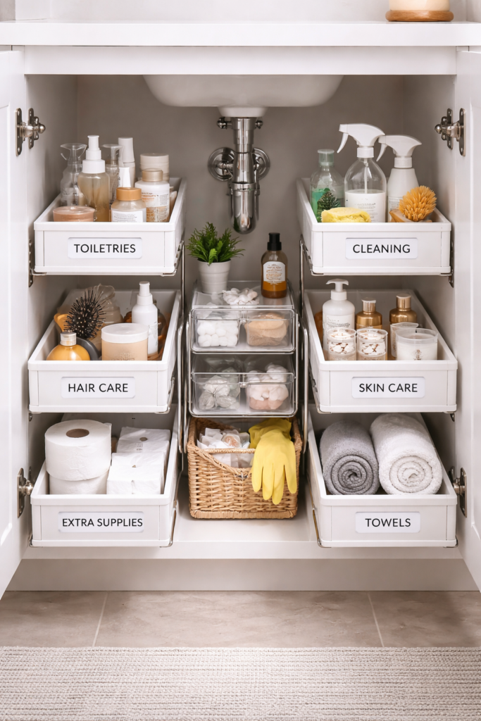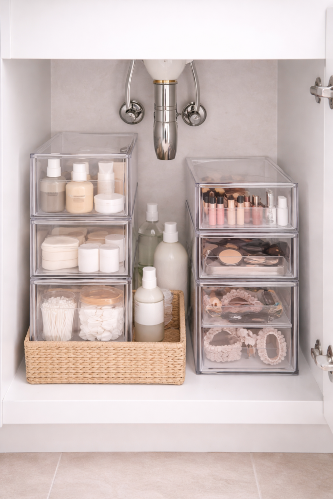 One of the easiest ways to maximize under sink space is by using stackable drawers. These allow you to separate items like toiletries, cleaning supplies, and backups without everything piling together.