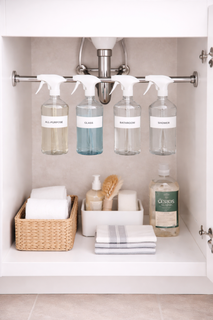 A simple tension rod installed across the cabinet can instantly create hanging storage for spray bottles.