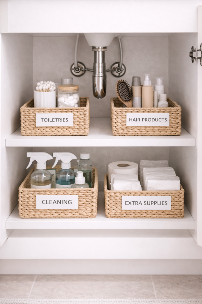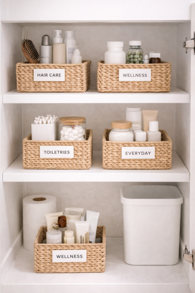 Grouping similar items into small baskets helps keep everything neat and easy to find.